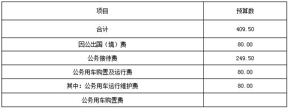 2016年公用经费中“三公”经费财政拨款预算409.50万元,其中:公务用车运行维护费80.00万元、公务接待费249.50万元、因公出国(境)费用80.00万元。与2015年预算同口径比较,“三公” 经费财政拨款预算下降30.50万元,降幅6.94%,主要为财政拨款预算公务接待费下降30.50万元。