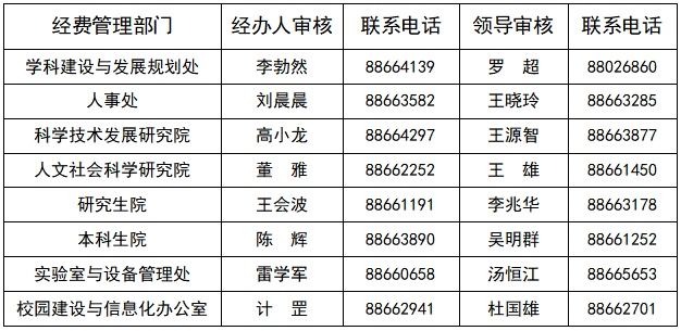 2、学科建设与发展规划处负责学科建设经费购置资产计划的立项审核;人事处负责人才项目经费购置资产计划的立项审核;科学技术发展研究院负责自然科学类科研经费购置资产计划的立项审核;人文社会科学研究院负责人文社科类科研经费购置资产计划的立项审核;本科生院负责本科实验实训教学场所(基地)资产购置计划的立项审核;研究生院负责研究生培养项目经费购置资产计划的立项审核;实验室与设备管理处负责实验室资产购置计划的审核与报批;校园建设与信息化办公室负责新建房屋与构筑物项目(含电梯、中央空调、锅炉等固定资产)的审核。经费审批部门对所审核项目负责。经费审批部门工作人员联系方式如下: