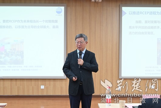 特聘仪式结束后,迟福林教授就“如何继续提高湖北对外开放的深度和广度?”“通过新通道新平台加速链接世界,同时兼顾经济发展和经济安全”等问题,开展了以“大变局下的高水平开放”为主题的学术讲座。