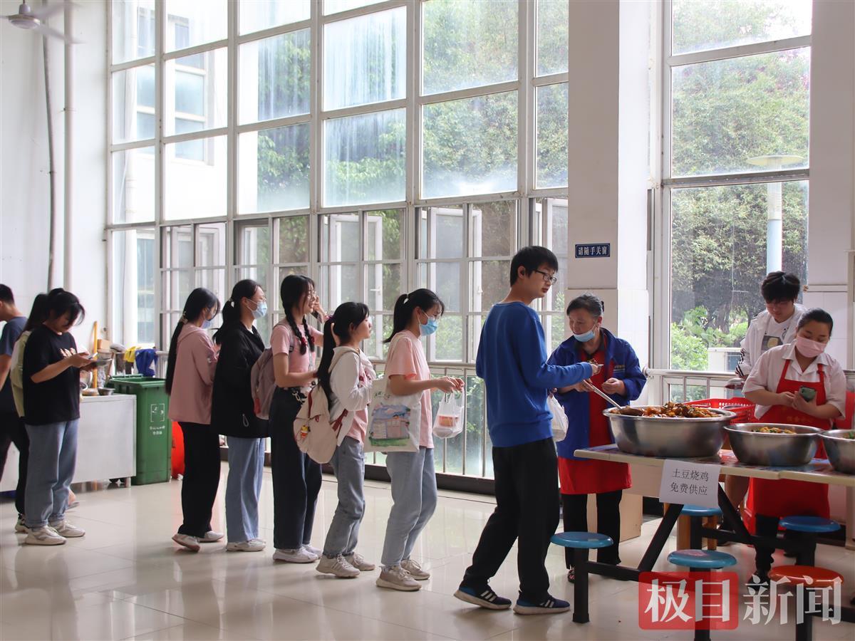 “看,这可是我们亲手种的土豆。”扑鼻的香味吸引了越来越多的学生,队伍排了十米多远,学生李嘉豪手里端着热腾腾的菜,向大家“炫耀”。八大盆土豆烧鸡,一点点见底,餐具用完了,学生们就直接浇在自己的米饭上。