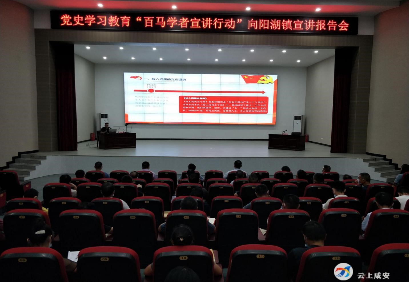 为深入学习领会习近平总书记"七一"重要讲话精神,同时将学习成果运用到乡村振兴和服务群众的具体工作中,2021年7月26日,我校马克思主义学院教师杨海军副教授和王昊博士为咸安区向阳湖镇村党员干部集中宣讲习近平总书记"七一"重要讲话精神。咸安区委宣传部副部长熊鸣、咸安区委宣传部理论科科长李伟、咸安区向阳湖镇全体领导班子成员及镇村党员干部等参加了宣讲报告会。