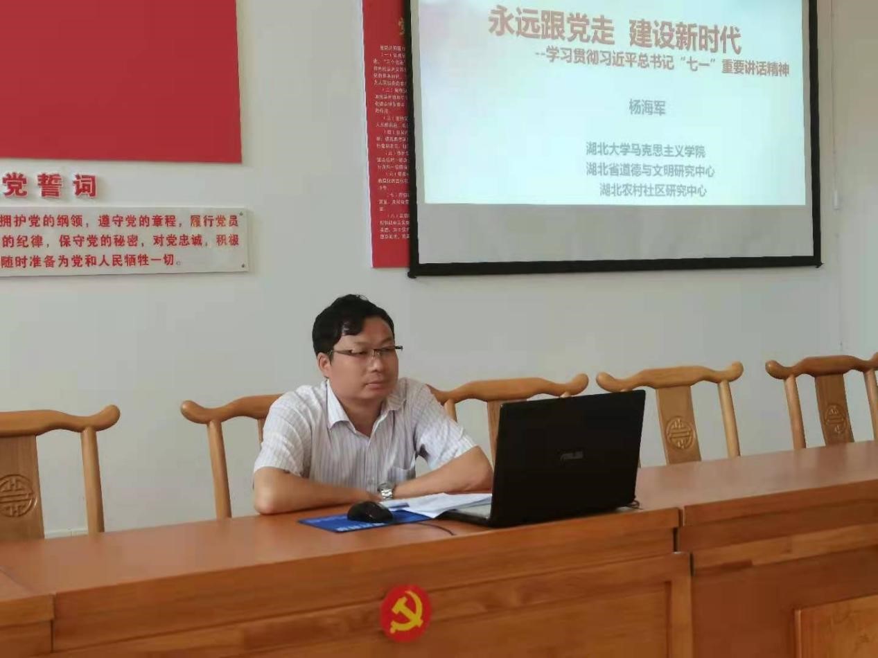 杨海军副教授以《永远跟党走,建设新时代》为题,从"七一"重要讲话精神的重要意义、主要内容、如何贯彻等三方面向村党员干部宣讲了习近平总书记"七一"重要讲话精神。