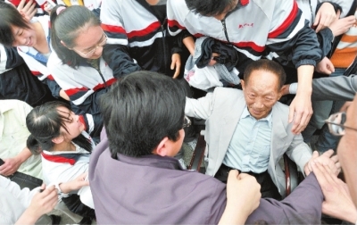 2009年4月21日,袁隆平回到母校武汉四中,学生们争相和袁隆平院士握手。长江日报记者周超摄