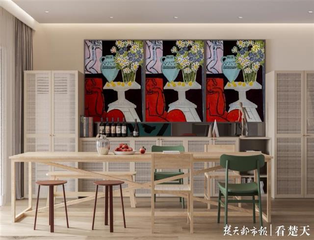不仅如此,邓伊玲还在样板间装饰品的选择上大胆尝试,连用三幅马蒂斯的作品《雏菊》,并通过将每幅画中的一朵菊花改用不同的色彩,巧妙将其融入样板间的场景中,暗示着生活中多样的精彩与可以期许和发现的趣味。同时,她还引用了马蒂斯的另外一幅作品《FACE-MASK》,在空间中制造了如戏剧般的亮点与冲突。“恰到好处的装饰品可以增加生活的情趣和记忆点,更好地表达在此项目设计中思考者如野兽派初现时的探索精神、先锋性、实验性和面对未来生活的态度。”邓伊玲说。