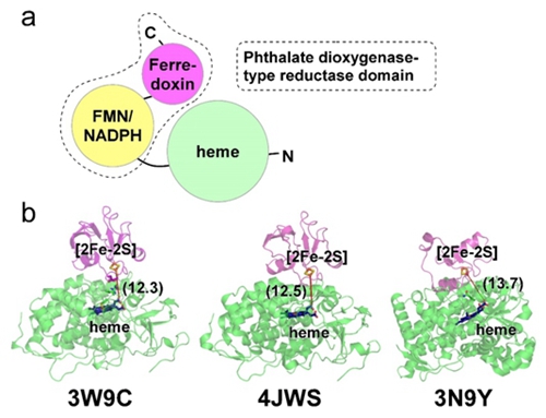 另一方面,铁氧还蛋白结构域和血红素的直线距离达25.3 Å,超过目前认定的有效直接电子传递距离。