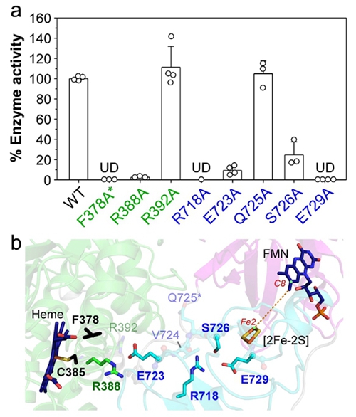 结构分析表明,在这种酶中,FMN足够接近铁硫簇以实现直接电子转移;但血红素离铁硫簇太远,不允许电子直接转移,而是依靠5个“二传手”氨基酸实现传递。