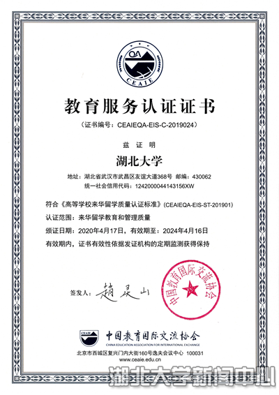 据悉,全国高校来华留学质量认证由教育部委托中国教育国际交流协会作为第三方评价机构组织实施,旨在建立、健全来华留学质量保障体系,助力来华留学事业提质增效,打造“留学中国”品牌,是国家认证认可监督管理委员会批准实施的认证项目。该认证自2016年试运行三年后,2019年正式实施,此次全国有26所高校通过正式认证。(中国教育在线 :https://www.eol.cn/hubei/bfxy/202005/t20200515_1727392.shtml