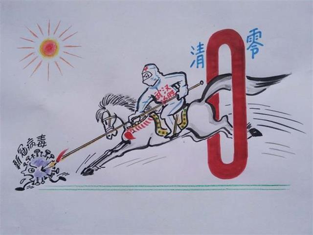 在抗击新冠肺炎疫情的战斗中,广大医护工作者舍己为人的动人事迹感动了邹敬泉,于是白衣天使成为他漫画中出场最频繁的形象。白衣“战士”身骑白龙驹,快马加鞭地迈过了“清零”的门槛,手中的红缨枪正刺向逃跑的新冠病毒,头顶的艳阳仿佛胜利的曙光。在漫画《清零》中,邹敬泉将对战胜病毒的美好期待表达得淋漓尽致。