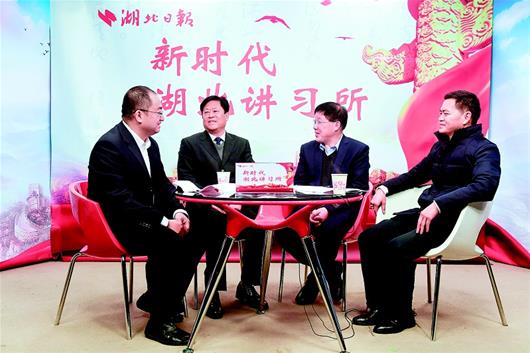湖北日报讯 图为:受邀嘉宾陶宏家(左二)、吴成国(右二)、喻泉源(右一)接受记者访谈。(湖北日报全媒记者 魏铼 摄)