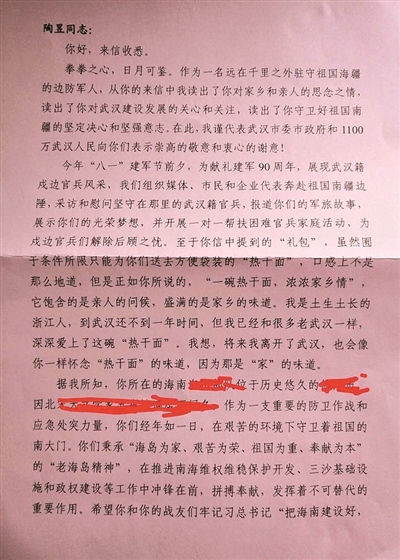 没想到很快陈书记竟给我回信了!信中,他勉励我,“希望你和你的战友们牢记习总书记‘把海南建设好,把祖国南大门守卫好’的殷切嘱托,履职尽责、忠诚奉献,铁骨铮铮守卫南疆,军民融合建设海南。”我将这封回信和战友们分享,大家备受振奋和鼓舞,都表示作为武汉籍军人决不会给家乡人丢脸!