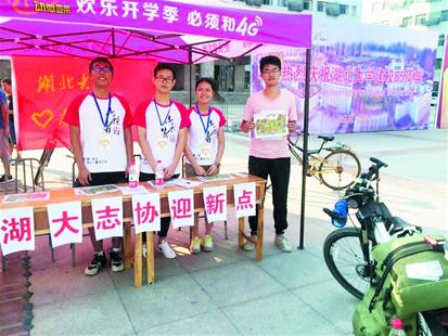 图为:报到点上,同学们争相与骑行来校的黄冠(右一)合影